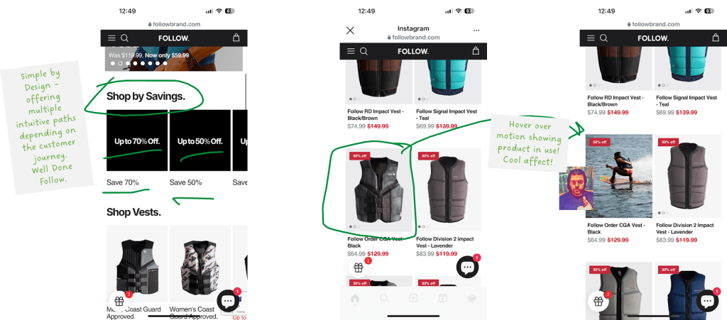 Follow. brand does a nice job here with the savings directly targeted to Black Friday and Holiday shoppers while showcasing sale prices on the product listing page. Further, they amplify the experience with a hover over that switches from the product view to an action shot. Personally, I like this treatment and think it does a nice job bringing an ‘action brand’ to life online.
