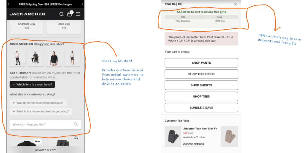 The more I explore, the more I am drawn to unique but simple ways brands pull in features that aid in the shopping journey. One such example is from Jack Archer, where I noticed 2 features that grabbed my attention and felt worthy of a blog post. The first feature is their intuitive shopping assistant, which guides users using customer questions to narrow down the product selection, enhancing the overall shopping experience. The second feature is the way they highlight and offer free gifts. These thoughtful elements not only simplify the shopping process but also create a more engaging and satisfying experience for consumers.